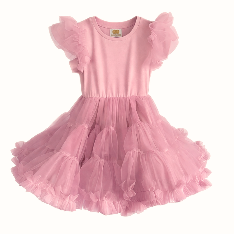 SUKIENKA Z FALBANKAMI KRÓTKI RĘKAW- JASNY BRUDNY RÓŻ